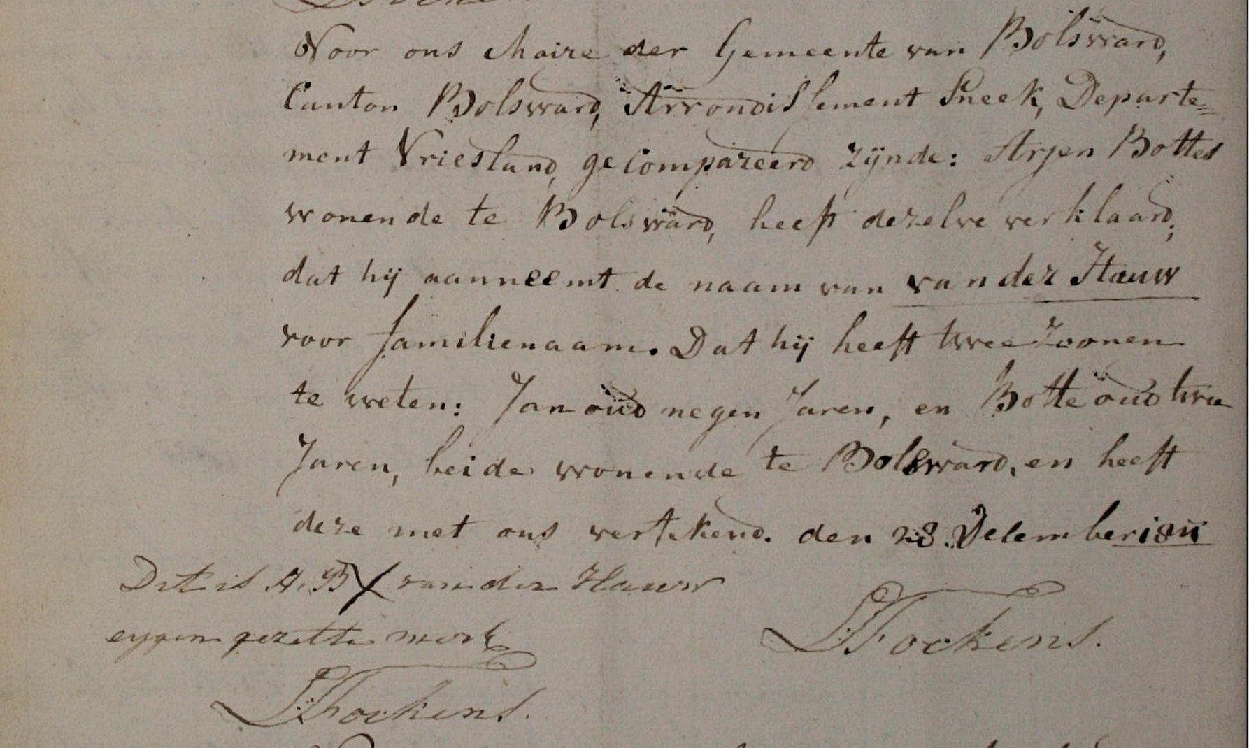 De naam Van der Hauw is pas aangenomen op 28 december 1811 te Bolsward door Arjen Bottes (Vc). In december van dat laatste jaar ondertekende Arjen Bottes te Bolsward de volgende akte: