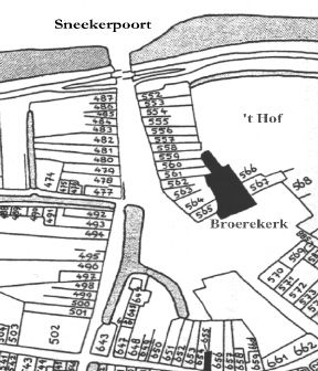 Detail plattegrond Bolsward begin 19e eeuw. Het gebied achter de Broerekerk wordt nog steeds Het Hof