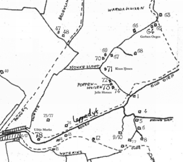 Het kaartje hiernaast geeft de omgeving van Oldeboorn aan met de boerderijbewoners in 1782 aan de hand van getuigenverklaringen ten tijde van een beroving van Jetkse Arjens.